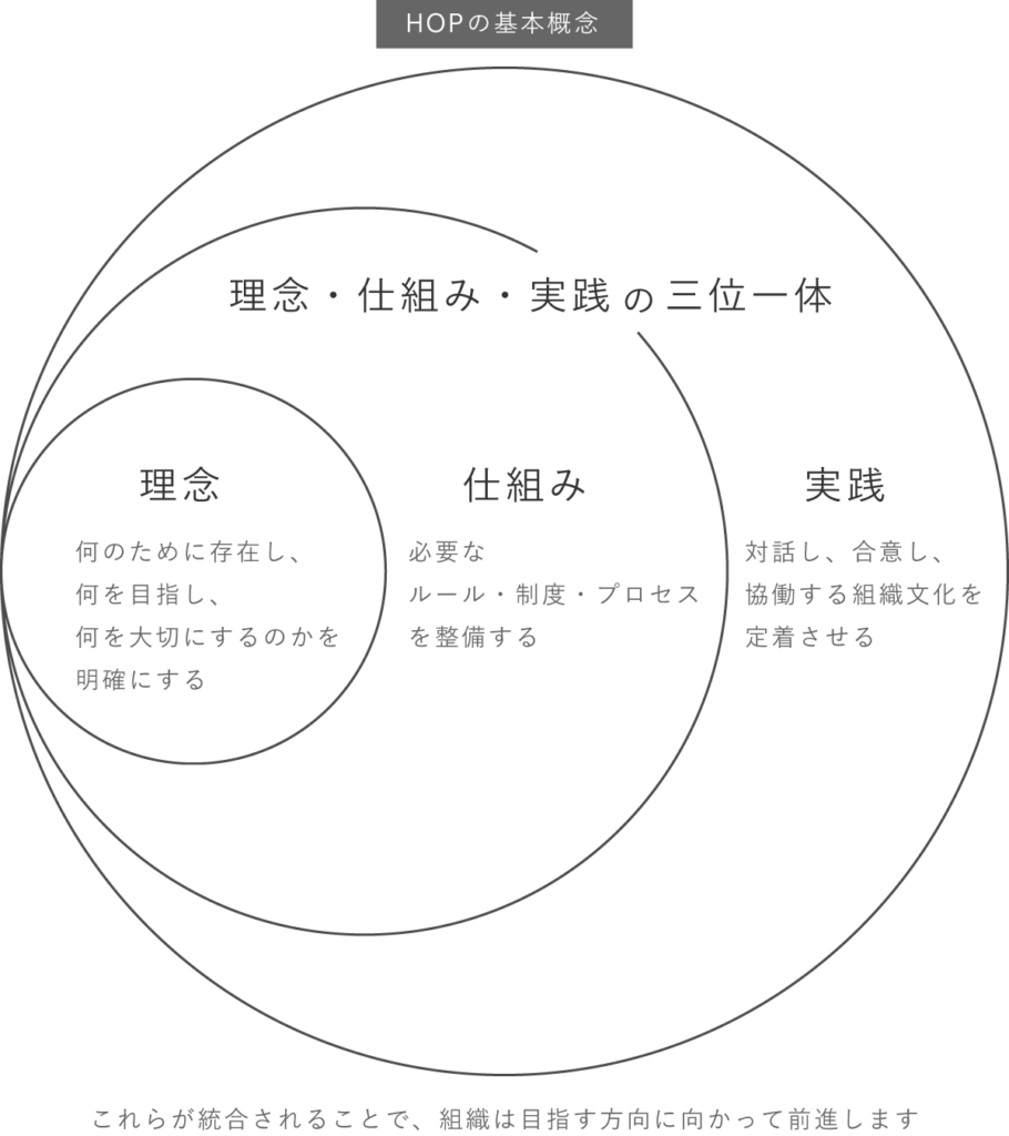 HOPは、理念・仕組み・実践を三位一体で整え、組織が「自走する状態」になるまで伴走します。